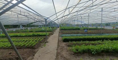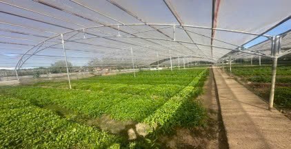 Vườn rau khung giàn có mái che bằng lưới chống côn trùng giúp chắn gió mặn và giữ ẩm